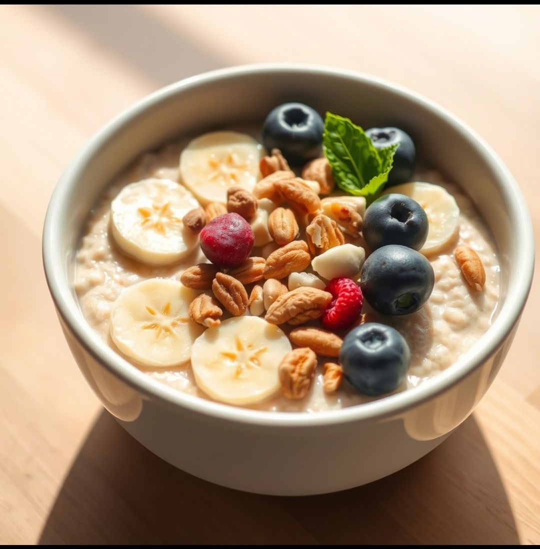 Вот идея для вкусного и питательного завтрака, который легко приготовить: - ½ стакана овсяных хлопьев - 1 стакан молока (обычного, растительного или воды) - 1 банан - Щепотка соли - 1 ч. ложка меда или кленового сиропа (по желанию) - Горсть свежих или замороженных ягод (клубника, малина, черника) - 1 ст. ложка рубленых орехов (грецкие, миндаль, фундук) - Щепотка корицы (по желанию) 1. В небольшой кастрюле доведите до кипения молоко (или воду). Добавьте овсяные хлопья и щепотку соли. 2. Уменьшите огонь и варите овсянку на медленном огне 3–5 минут, постоянно помешивая, пока она не станет густой и кремовой. 3. Пока овсянка готовится, нарежьте банан кружочками или дольками. 4. Когда каша будет готова, добавьте мед или кленовый сироп, если хотите сделать ее немного слаще. 5. Разложите овсянку по тарелке или миске, украсьте сверху ягодами, кусочками банана и рублеными орехами. 6. Посыпьте корицей для аромата. - Если вы любите более богатый вкус, можно добавить ложку натурального йогурта