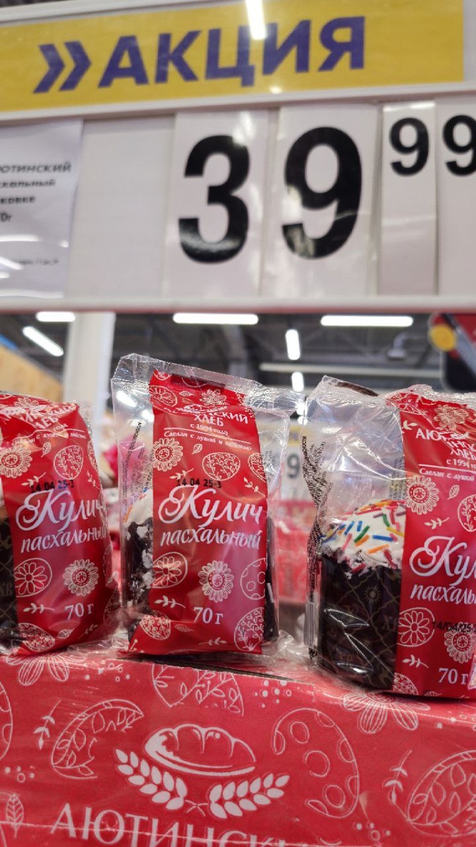 Сегодня побывали в Ленте, показываю по какой цене можно приобрести куличи. Итак, начну с самого маленького кулича. Вес его всего 70 г, а стоит он 40 рублей. выпекает его пекарня "Аютинский хлеб". Он такой маленький, но деткам наверно точно понравится. Куличи с весом 130 гр стоят уже 60 рублей, тот же самый хлебокомбинат. Следом идут куличи по 230 г. И цена уже 100 рублей за кулич. Куличи весом 430 гр стоят 155 рублей. А можно приобрести куличи этого же хлебокомбината, но в подарочной, картонной упаковке с творогом и цукатами. Он стоит уже подороже. 214 рублей за 250 грамм. В Ленте огромный выбор куличей. Есть и вот такие. 120 рублей за 260 г. А это из пекарни Ленты. За 400 граммовый кулич вы отдадите 330 рублей. А вот такой кулич "Иерусалимский" стоит 400 рублей за 500 граммовый кулич. Представлены так же куличи кондитерской "Золотой колос". 300 граммовый кулич стоит 230 рублей. Цены разные. Куличи на любой вкус. А вы сами печете куличи или покупаете? ________ Мой Телеграм канал