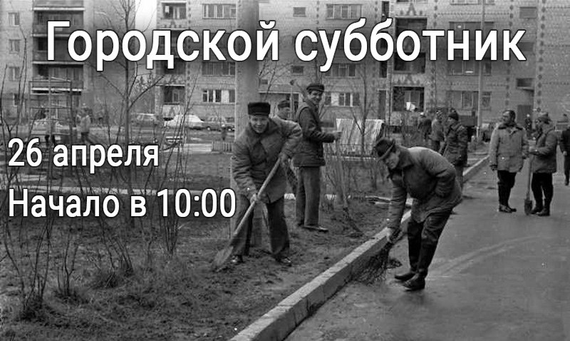26 апреля в Краснознаменске состоится общегородской субботник. Начало в 10:00. В ходе субботника просим вас принять активное участие в уборке придомовых территорий. Для жителей будут организованы пункты горячего питания (чай,пирожки) по следующим адресам: - Парк «Беличий»; - Городской парк; - Гимназия №2; - Лицей им Г.С. Титова. Информация о местах выдачи инвентаря будет доведена вашими управляющими компаниями. (с) Администрация городского округа Краснознаменск