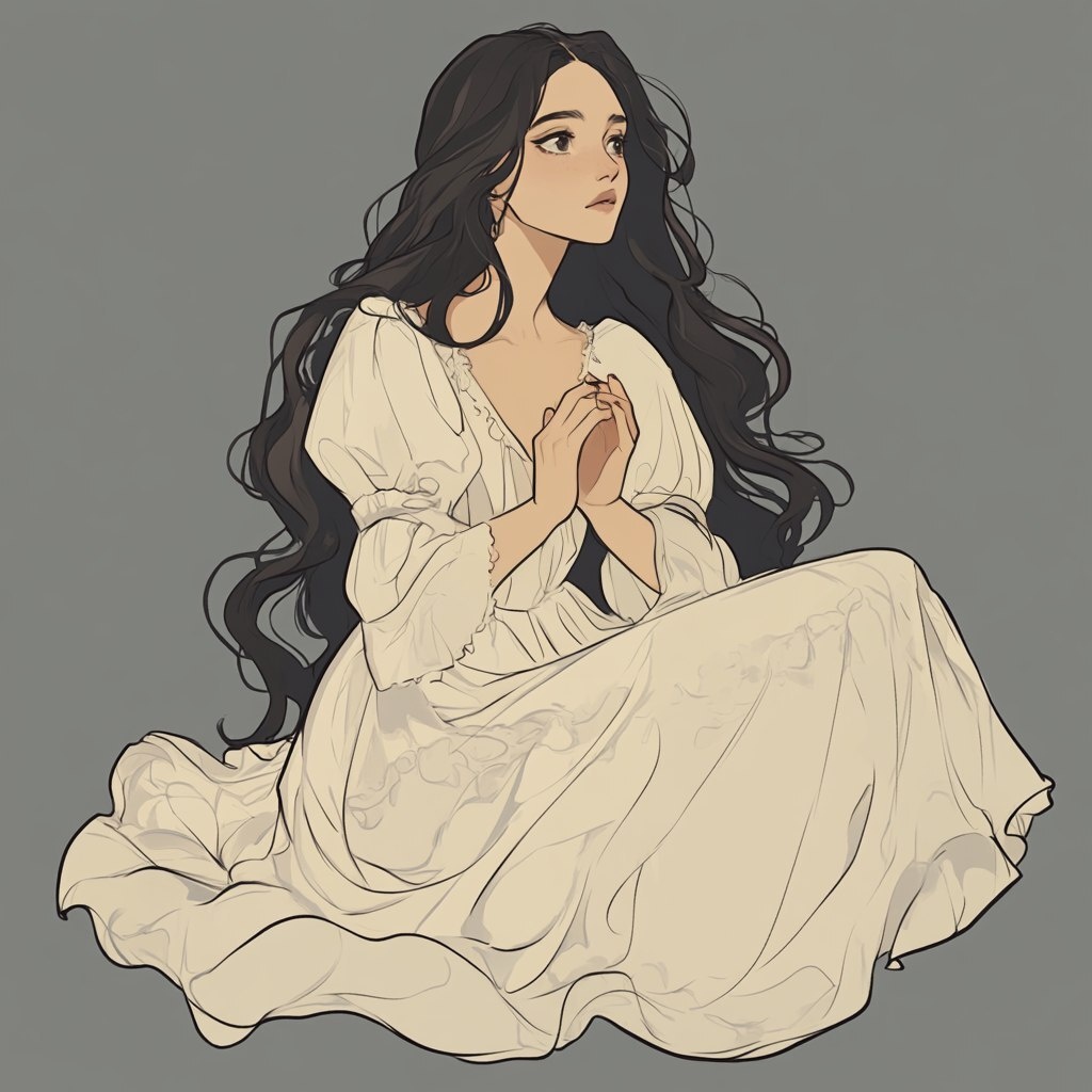 Создано на основе запроса: Sitting pose of a girl 3/4 view, waist-up portrait. Slight low angle shot. She puts both hands on her heart, in a position of vulnerability, slightly bent forward, looking in front of her. Very long and thick wavy hair. She wears a long white dress that flows around her. Mucha style. Abigail Larson style --- Автоперевод: Сидящая поза девушки 3/4 вида, портрет талии. Какое твое мнение? 🤔 https://dzen.ru/id/65c0c65c86e4f837c27b24d7 #ИИ #AI #нейросеть #midjourney #art