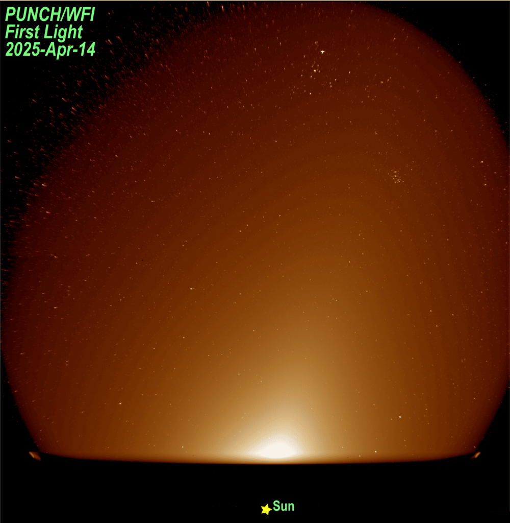 Спутники миссии Polarimeter to Unify the Corona and Heliosphere (PUNCH) получили первые изображения солнечной короны и солнечного ветра. Спутники миссии PUNCH, которые в марте вывели на полярную орбиту Земли, начали работать и передали первые изображения солнечной короны. Четыре небольших спутника размером с чемодан, действуют как единый виртуальный телескоп: три широкоугольных камеры, расположенные в углах равностороннего треугольника, дополняет коронограф. Миссия изучит, как солнечная корона переходит в солнечный ветер. Мы открыли дверцы приборов на камере ближнего поля зрения и одной широкоугольной камеры 14 апреля. 16 апреля открыли дверцы два других широкоугольных прибора, получив первые демонстрационные изображения. Все четыре прибора функционируют, как задумано. Крейг ДеФорест, участник миссии из Юго-Западного научно-исследовательского института США Первое комбинированное изображение солнечной короны миссии PUNCH. Изображение: Courtesy of NASA/SwRI Сложность миссии — в фиксации