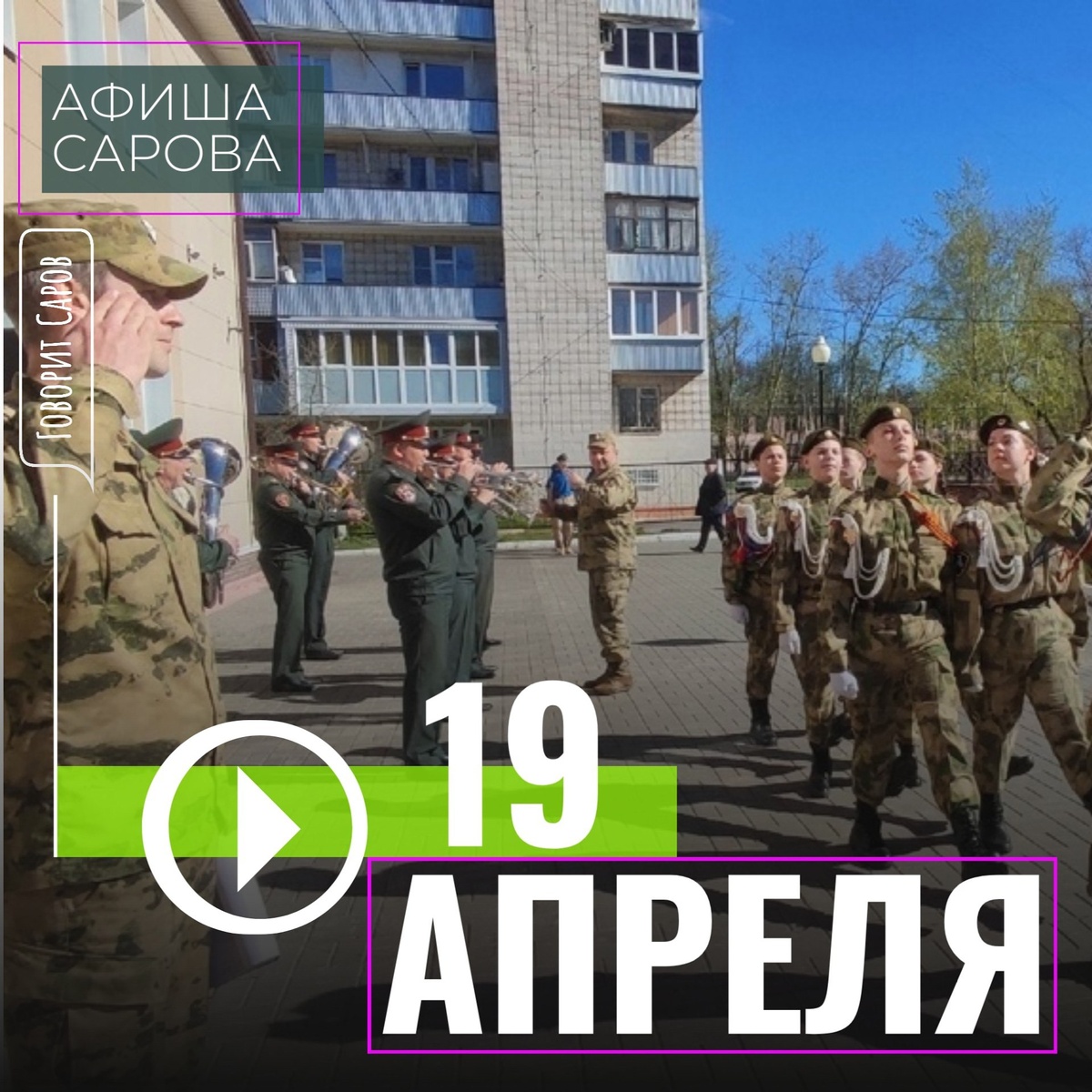 ↗ ЧТО ГДЕ ПРОИСХОДИТ В САРОВЕ 19 АПРЕЛЯ 🎭Саровский драматический театр (пр.Музрукова, 26, тел.9-83-83) 11:00 Крошка Енот, Сказка для малышей, 6+ 18:00 «Женитьба Бальзаминова», комедия, А. Островский, 16+ 🧸Театр кукол «Кузнечик» (ЦКР на ул.Менделеева, д.50а, тел. 9-83-83, 9-83-82) 11:00, 16:00 «Принцесса Крапинка» В. Трофимова (0+) (спектакль рекомендован к просмотру детям с 4-х лет) 👫Дом Молодежи (ул. Зернова, д.64, тел.9-82-52, 9-82-59) 18:00 «Кино квиз» *Регистрация по телефону +7 (964)8351478 🏚Военный комиссариат Сарова 09:00 Пост №1 – городские соревнования почетных караулов 🥅Ледовый дворец (ул. Московская, 5, Саров, тел. 9-49-14) 09:30-10:45 Кубок РФЯЦ-ВНИИЭФ по хоккею Союз-Заряд 20:00-21:30 Массовое катание на коньках 🎯Тир МБОУ "Школа №14" (ул. Юности, 11, тел. 9-51-40) 15:00 Соревнования города Сарова «Кубок Победы по пулевой стрельбе, посвященные 80-летию Победы в Великой Отечественной Войне» 🏸Молодежный центр (ул.…