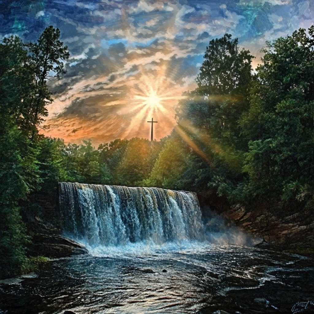 Создано на основе запроса: this image of a waterfall in the woods with a sky with a dramatic easter cross burst from the cloud with sunlight