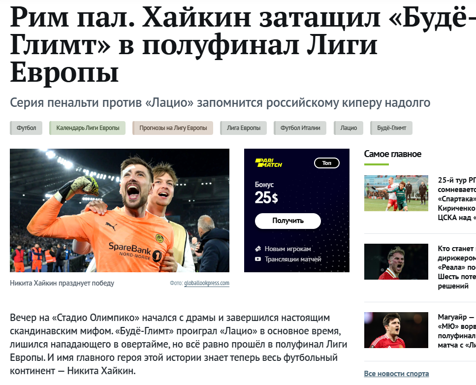 Эта победа норвежцев стала сенсацией в мировом футболе, а ее главный герой Никита Хайкин ворвался в ряды лучших голкиперов мира. Любители футбола знают это имя хорошо - Никита Хайкин. Хороший стабильный вратарь, но долгое время в числе суперзвезд не блистал. И вот настал его звездный час. Обложка российского спортивного СМИ: Итак начну сначала. Команда из небольшого провинциального городка в 50 тысяч населения - Будё , который находится где- то у черта на куличках в районе Заполярного круга. Команда по нынешним меркам не богатая, легионеров не покупает, богатых спонсоров и хозяев не имеет. В числе игроков три датчанина, один россиянин и все остальные местные - норвежцы. Причем, Никита начал играть в команде пять лет назад в марте 2019, когда команда находилась на скромных позициях в турнирной таблице Норвегии и была не известна на международной арене. И вместе с командой, он прошел весь этот путь до чемпионов Норвегии и выхода на мировые топы. Итальянский «Лацио» был фаворитом против