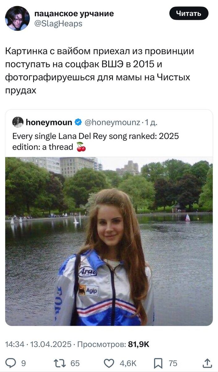 «Это Чистые пруды что ли?». В Твиттере подняли старое фото Ланы Дель Рей, а в комментариях не могут понять, где оно сделано. Фавориты опроса — Чистые пруды, Красногвардейские пруды и Патрики.