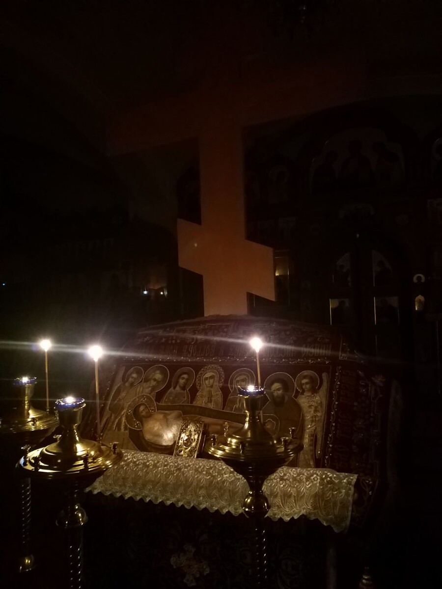 После чтения Царских часов, на вечерне, братия обители в священном сане совершили вынос Плащаницы Спасителя из алтаря, для поклонения
