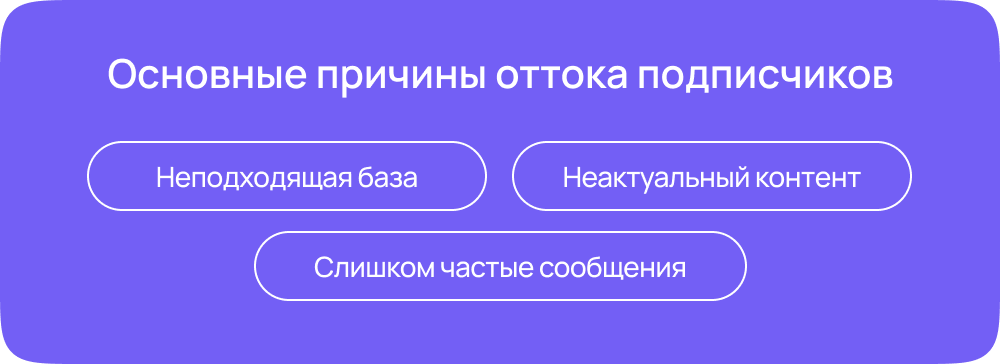 - Неактуальный контент — предложения не соответствуют интересам аудитории, не несут ценности и выгоды для получателей рассылки.