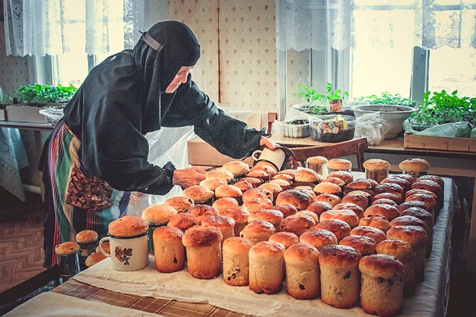 В русских монастырях рецепты пасхальных куличей передаются из поколения в поколение. Здесь их выпекают с молитвой, на натуральных продуктах, часто по старинным технологиям – в дровяных печах или на особой закваске. Здешние куличи – эталон традиционной выпечки. Готовят их на освященной воде, добавляя отборный изюм, цукаты и свежие яйца от монастырских кур. Тесто получается необыкновенно нежным, с едва уловимым медовым послевкусием. Самый популярный вариант – кулич "Царский", который выпекают в огромных формах и украшают белоснежной глазурью с позолотой. Московская обитель славится куличами с легкой цитрусовой ноткой – в тесто добавляют цедру апельсина и немного коньяка. Выпечка получается воздушной, с хрустящей корочкой и влажной мякотью. Особый шик – куличи в подарочных жестяных коробках с видами монастыря. Эти куличи имеют неповторимый "северный" характер – их выпекают в старинных печах на березовых дровах, отчего выпечка приобретает едва уловимый дымный аромат. В тесто добавляют мест