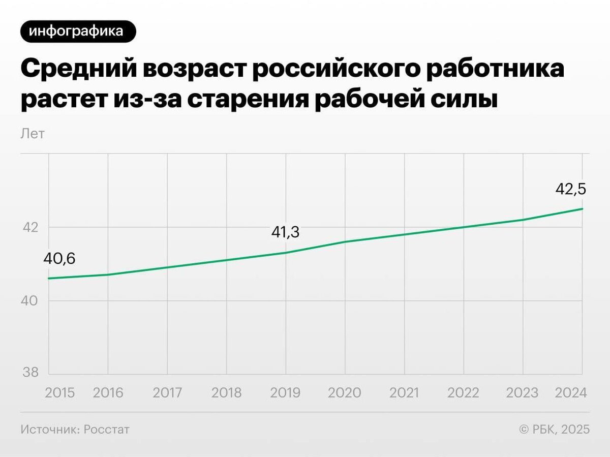 Средний возраст работников в России достиг рекордных 42,5 лет, увеличившись на два года за последнее десятилетие
