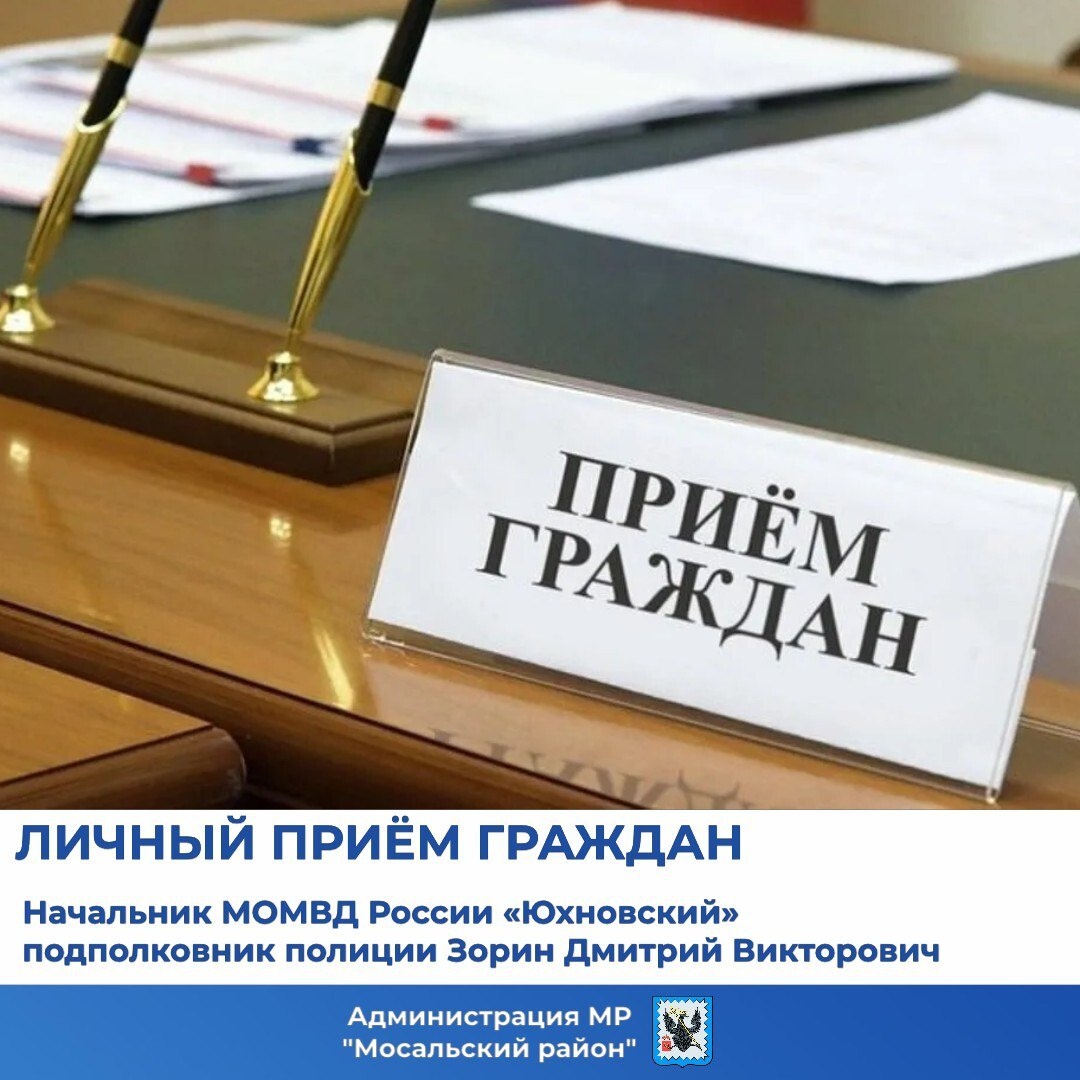☑️ 14 мая будет вести личный приём граждан- начальник МОМВД России «Юхновский» подполковник полиции Зорин Дмитрий Викторович