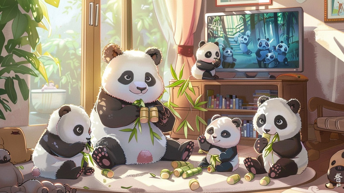 Создано на основе запроса: cute cartoon panda family with colorful baby pandas, sitting together eating bamboo and watching cartoons on a