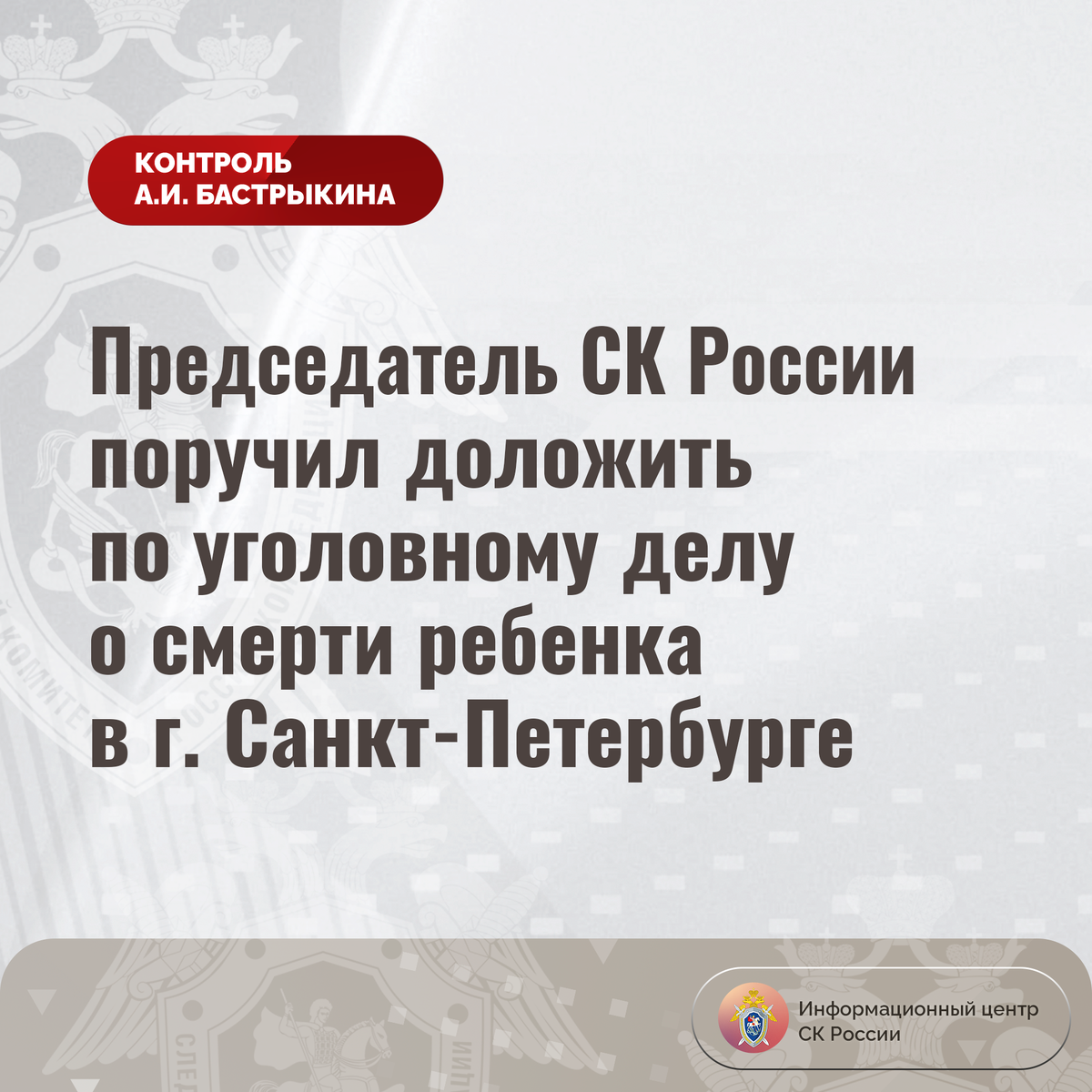 Председатель СК России поручил доложить по уголовному делу о смерти ребенка в г. Санкт-Петербурге В ГСУ СК России по городу Санкт-Петербургу возбуждено уголовное дело по ст. 109 УК РФ (причинение смерти по неосторожности) по факту смерти грудного ребенка в городе Санкт-Петербурге. По данным следствия, 15 апреля текущего года местная жительница оставила свою девятимесячную дочь по месту жительства под присмотром знакомой. На следующий день мать вернулась домой и обнаружила, что ребенок скончался, при этом женщина, с которой он находился, покинула квартиру. Ситуация освещалась в эфире федерального телеканала и других СМИ. Председатель Следственного комитета Российской Федерации Александр Иванович Бастрыкин поручил и.о. руководителя ГСУ СК России по городу Санкт-Петербургу Олегу Валерьевичу Бобкову доложить о предварительных и окончательных результатах расследования уголовного дела. Исполнение поручения поставлено на контроль в центральном аппарате ведомства. #СледственныйКомитет #СКРосси