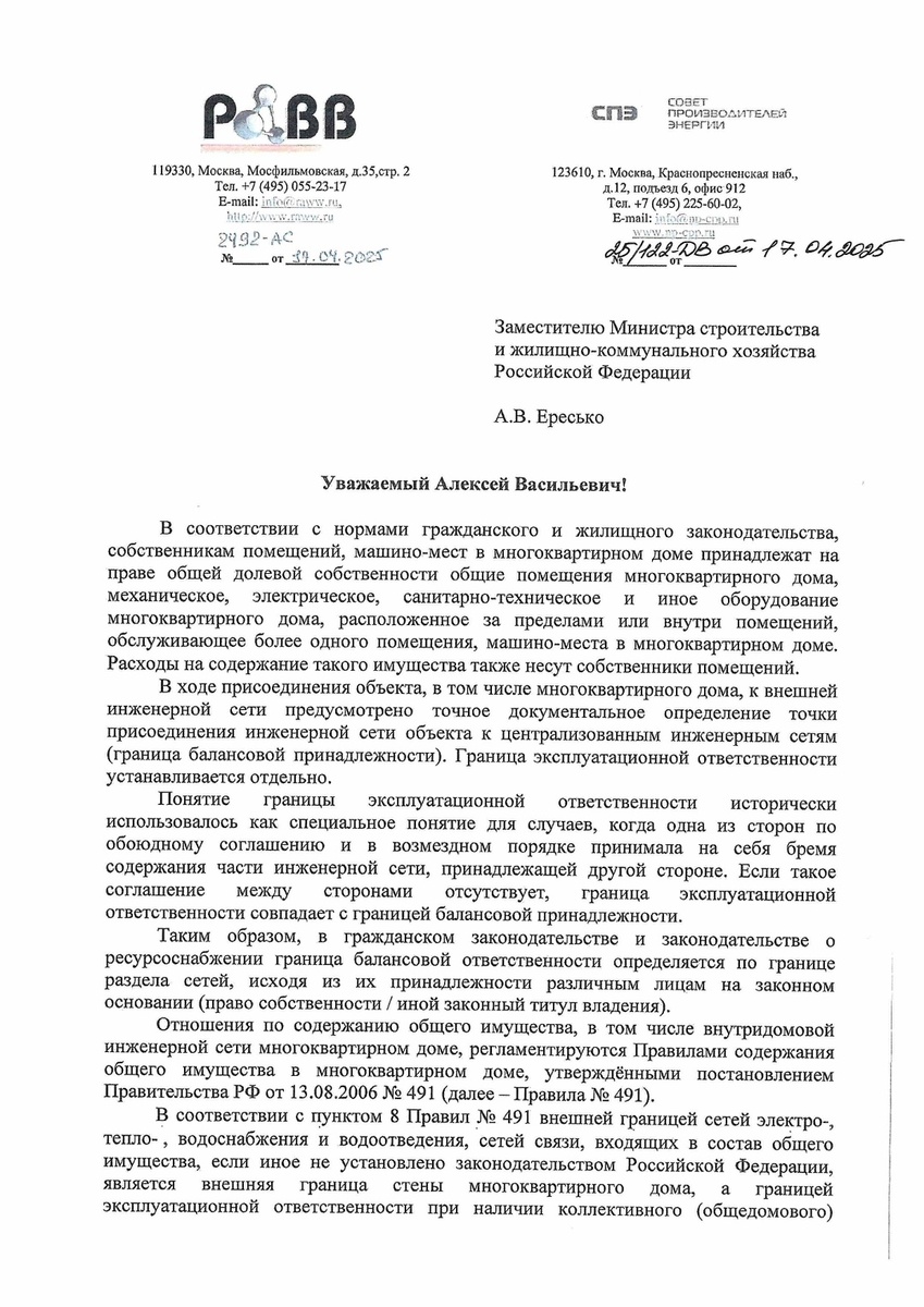 ☝ РАВВ совместно с Советом производителей энергии предприняла очередные шаги по решению проблем с границей балансовой принадлежности и эксплуатационной ответственности сетей тепло-, водоснабжения и водоотведения в многоквартирных домах Стороны направили в Минстрой России проекты изменений Правил содержания общего имущества в МКД и Правил предоставления коммунальных услуг в МКД, которые устанавливают чёткие границы раздела внутридомовых инженерных систем и централизованных сетей: для тепло-, элктро- и водоснабжения это - внешняя граница стены дома, для водоотведения - это место примыкания канализационного выпуска к стене первого смотрового колодца. Напомним, что сегодня водоканалы сталкиваются с техническими и организационными проблемами обслуживания участков сети водоотведения от внешней границы стены многоквартирного дома до первого смотрового колодца. Среди технических проблем: отсутствие доступа к подвальным помещениям многоквартирного дома для своевременного и оперативного обсл