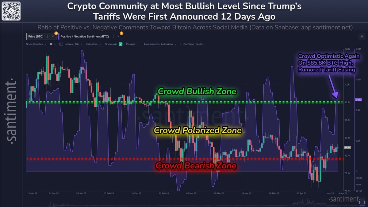 Santiment: Рынок оживает после паузы с пошлинами После приостановки тарифной атаки Трампа на рынке резко вырос оптимизм — Santiment зафиксировал рекорд по положительным комментариям с начала этой истории. Аналитики также видят всплеск бычьих прогнозов по BTC: если он приблизится к $90K, FOMO может взлететь вместе с ценой.