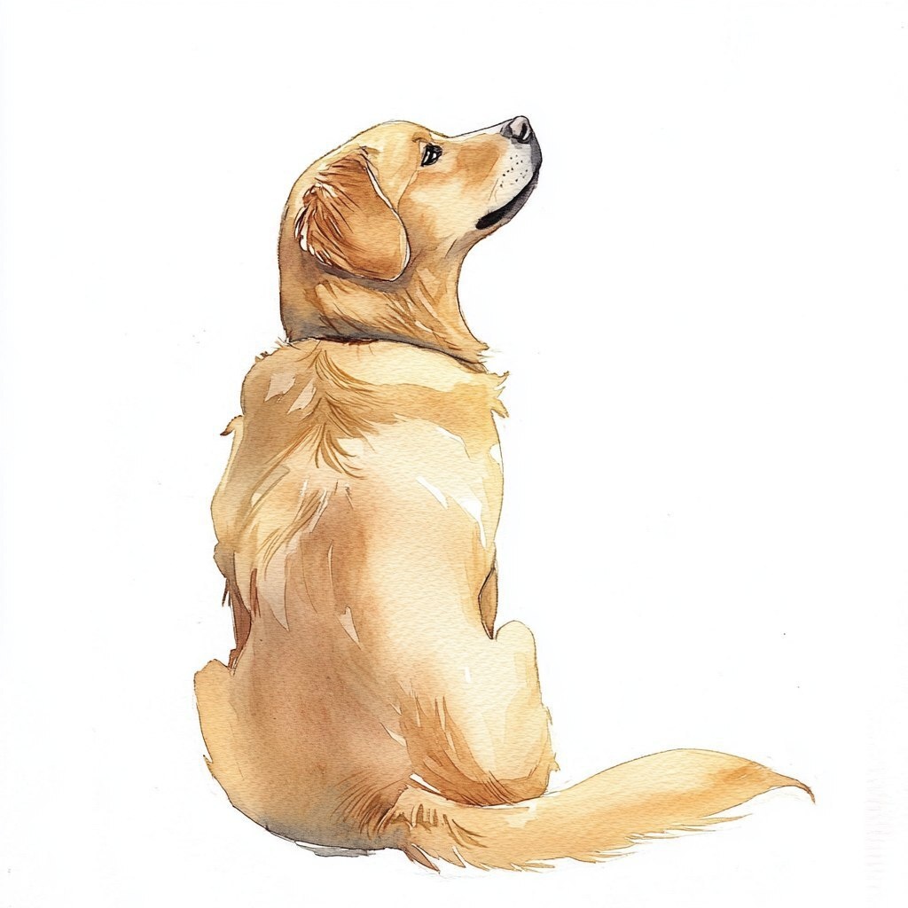 Создано на основе запроса: Golden Rertreiver back profile sitting down looking up, white background, Watercolour sketch minimalist