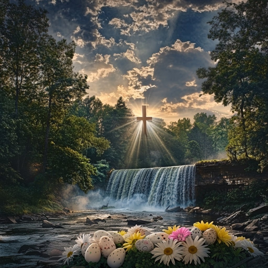 Создано на основе запроса: this image of a waterfall in the woods with a sky with a dramatic easter cross burst thru the clouds with sunrise