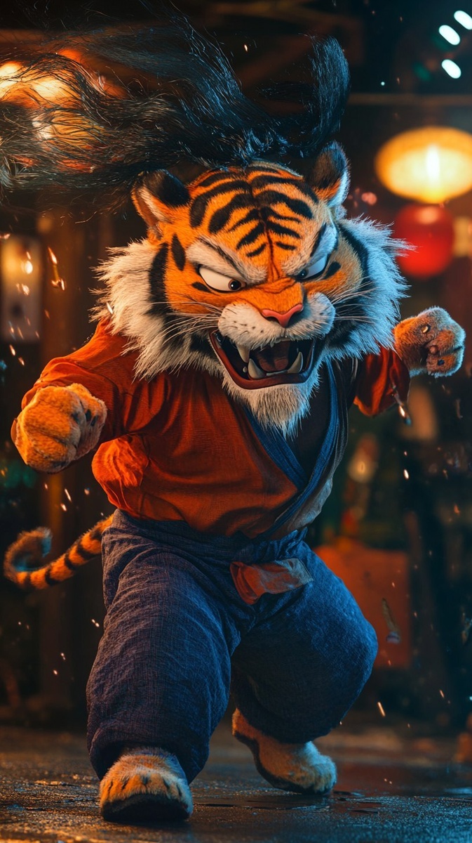 Создано на основе запроса: An image for an advertisement. A nighttime scene. A dried persimmon , goofy anthropormic tiger, with blowing long black hairs, dressed in modern clothes. He is angry and tries to fight someone. The image is playful and cartoonish. --- Автоперевод: Изображение для рекламы. Как тебе иллюстрация? 🤔 https://dzen.ru/id/65c0c65c86e4f837c27b24d7 #ИИ #AI #нейросеть #midjourney #art
