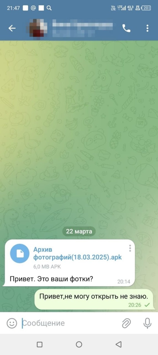 Опять про мошенников. Обратилась ко мне на этой неделе женщина вот с такой историей. У ее подруги взломали Telegram и со взломанного аккаунта прислали файл с комментарием «Это ваши фотки?». Инстинктивно хочется посмотреть, что же там за фото? Вот и наша героиня не удержалась и кликнула на файлик, который оказался вирусом. Соответственно жулики получили полный доступ к управлению телефоном и содержащейся в нем информации. Буквально через 5 минут потерпевшей стали приходить письма счастья о получении кредитов. По сравнению с другими обратившимися ко мне потерпевшими, можно сказать, что женщина отделалась легким испугом, всего лишь около 30 000 рублей. Отсюда мораль, никогда не открывайте никаких файлов, даже если они пришли от близких. Тем более исполнительский файл apk (как видно на фото) на системе android. P.S. Много раз я слышал что взламывают WhatsAp, но чтоб был взломан Telegram, слышу про такое впервые. Народ, поделитесь информацией, взламывали ли у кого-нибудь Telegram?