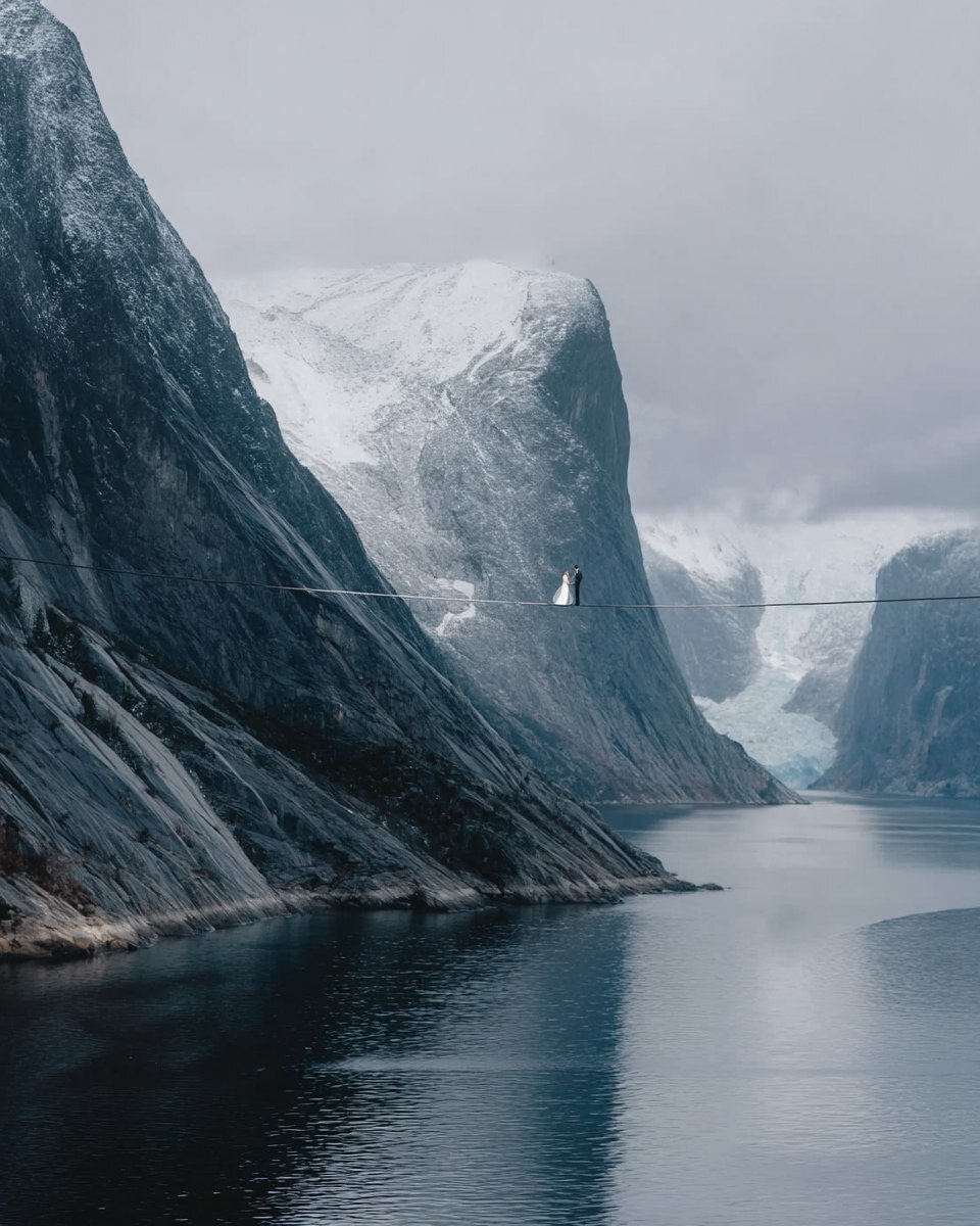 Создано на основе запроса: A couple in wedding attire walking across a fjord on a tight rope