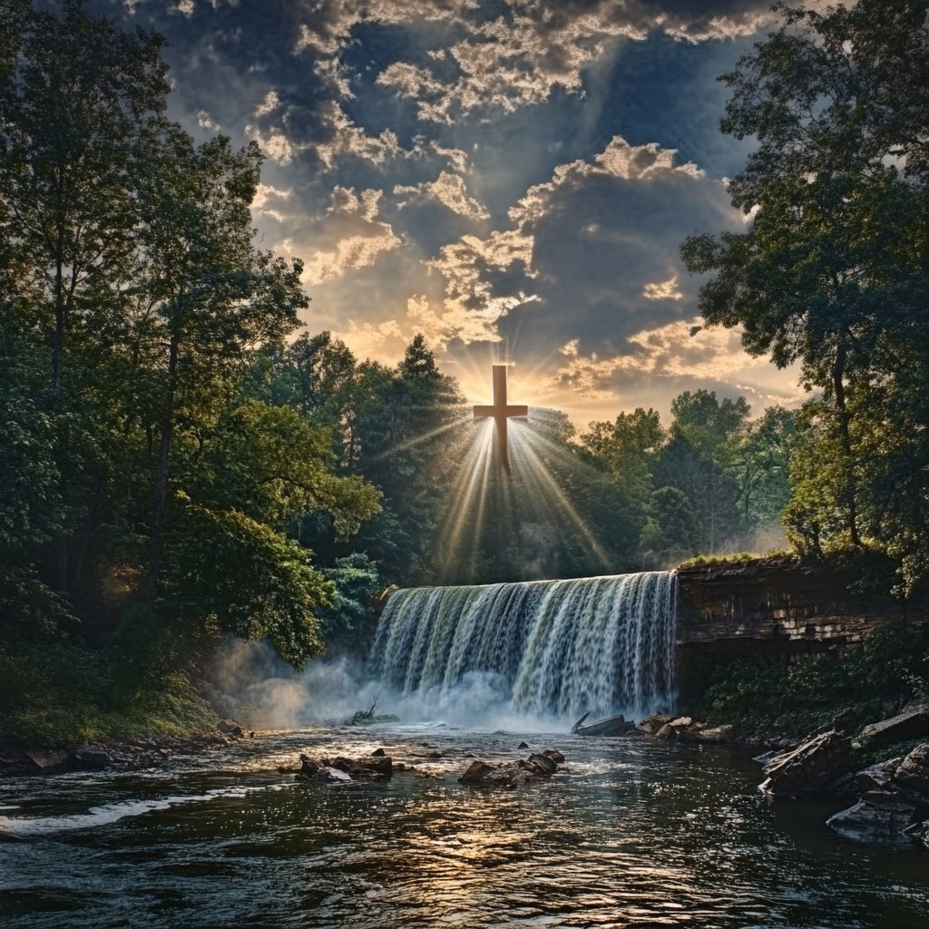 Создано на основе запроса: this image of a waterfall in the woods with a sky with a dramatic easter cross burst thru the clouds with sunrise in it
