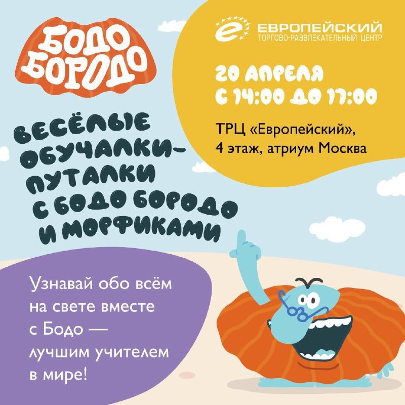 🆓 «МУЛЬТИБУМ» в «Европейском» @evropeiskiy_trc🥰- весёлые обучалки-путалки с Бодо Бородо и Морфиками. 🗓️20 апреля с 14:00 до 17:00 (воскресенье) 📍ТРЦ «Европейский», 4 этаж, Атриум: Москва 📚Узнаем обо всём на свете вместе с Бодо — лучшим учителем в мире! 👇В программе: 🔘Игра «Бокварь» 🔘Игра «У кого борода, тот и решает» 🔘Игра «Путешествие» 🔘Путанные Бодо-викторины 🔘Научное шоу-путаница 🔘Весёлые татушки «Всякая всячина» 🔘Мастерская Морфиков 🆓Бесплатно Подробнее ЗДЕСЬ 👨👩👧👦 @Together_with_kids Пост носит информационный характер