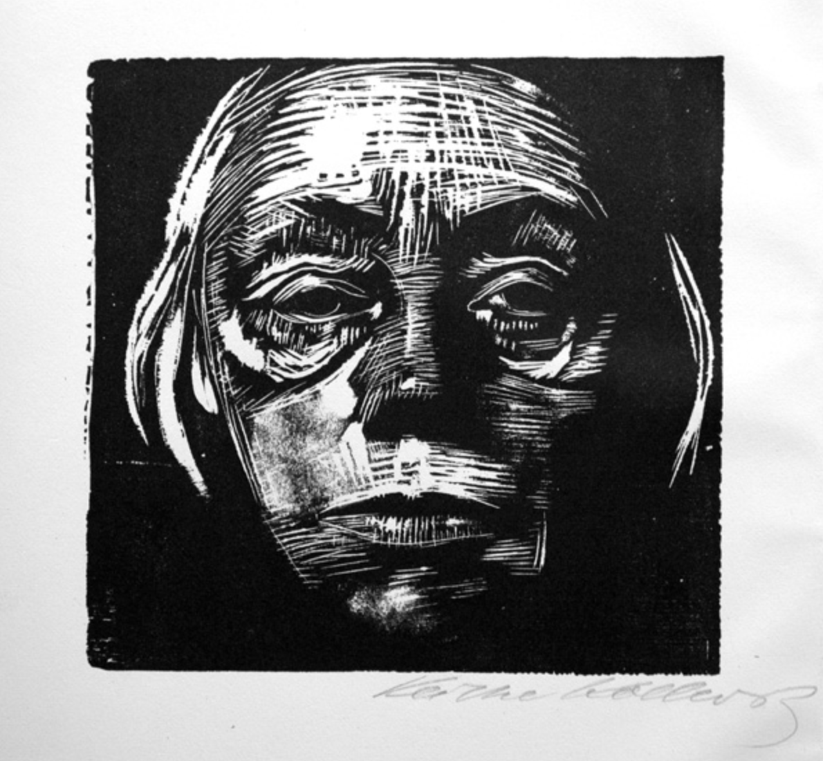 С графического автопортрета художницы Кете Кольвиц, созданного в 1923 году, на зрителя жестким взглядом смотрит немолодая измученная женщина. Кольвиц — одна из самых важных немецких художниц первой половины XX века. Хотя ее путь к самореализации в искусстве был сложным, в Берлине она добилась профессионального успеха, несмотря на увлечение непопулярными темами — бытом нуждающихся, крестьянством. Она намеренно ограничила себя черно-белой графикой и только иногда занималась еще и скульптурой. Скорбное выражение лица, которое зритель видит на автопортрете Кольвиц, связано с тяжелейшей личной драмой. Ее младший сын Петер погиб на Первой мировой войне, и художница винила в этом прежде всего себя. В начале боевых действий она была захвачена общим воодушевлением и считала, что эта война для Германии справедлива и что она обязательно закончится скорой победой, — поэтому поддержала желание молодого сына отправиться воевать добровольцем, хотя его отец, муж Кольвиц, пытался это предотвратить. Отп