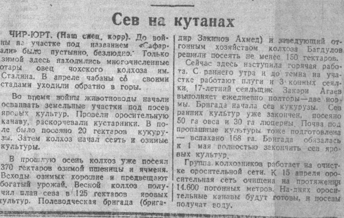 Сев на кутанах ЧИР-ЮРТ. (Наш спец. корр). До войны на участке под названием «Сафар-али» было пустынно, безлюдно. Только зимой здесь находились многочисленные отары овец чохского колхоза им. Сталина. В апреле чабаны со своими стадами уходили обратно в горы. Во время войны животноводы начали обрабатывать земли под яровые культуры, провели оросительную канаву и раскорчевали кустарники. Посеяли 20 га кукурузы и начали сеять озимые. Осенью колхоз посеял 370 га озимой пшеницы и ячменя, всходы хорошие. Весной план сева — 125 га яровых, но бригада решила засеять не менее 150 га. Сейчас активно работают плуги и сеялки. 17-летний Закари Агаев выполняет полторы-две нормы. Сев ранних культур завершен: посеяно 50 га овса и 30 га люцерны, вспахано 168 га под пропашные. Бригада обещает закончить сев яровых к 1 мая. Колхозники очищают оросительную сеть: к 15 апреля очищено 14 600 метров, и вскоре канавы будут готовы обеспечить водой посевы. Источник: "Дагестанская правда" за апрель 1945 года