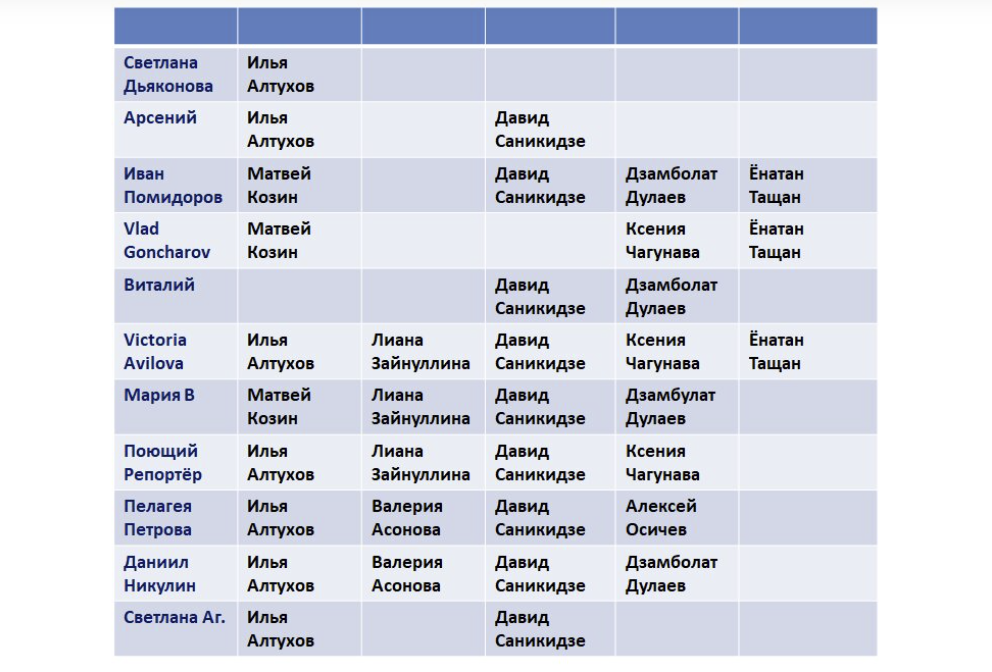 Здравствуйте! А мы здесь играем. Набрали "свои" команды и смотрим, как тает количество наших участников. Каждый из нас надеется, что именно его вокалист станет победителем проекта. :-))) Перед сегодняшним выпуском в списке "моих" конкурсантов остался только Илья Алтухов - вся надежда только на него. Если в финале он станет лучшим, то сразу семеро из нас станут победителями игры. У других игроков положение лучше, но шоу есть шоу, мы заранее никогда не узнаем, чем оно может завершиться. Показываю табличку: Смотрим сегодняшний выпуск (а это пока только полуфинал) и болеем за своих любимчиков. Посмотрю новые команды наставников и отмечу сердечками "наших" участников. Матвей Козин - 3❤️, Давид Саникидзе - 9❤️, Ксения Чагунава - 3❤️. Алексей Осичев - 1❤️, Ёнатан Тащан - 3❤️, Дзамболат Дулаев - 4❤️. Валентина Яньшина, Наталья Сергиенко, Валерия Асонова - 2❤️. Валерий Рагулин, Илья Алтухов - 7❤️, Лиана Зайнуллина - 3❤️. Если ориентироваться на наши симпатии, то в финале должны сразиться Д