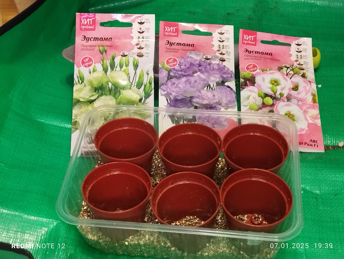 Сверху выкладывала по 1 семечку, не углубляла и увлажняла, растворяла оболочку точечно из шприца. Убрала в пакет до появления всходов, на полку под лампу.