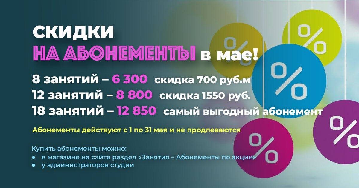 Майские скидки на абонементы в Йоге108 Приветствуем, друзья 👌 🎀Абонементы с 1 по 31 мая: * 8 занятий за 6 300₽ (вместо 7 000 руб.), * 12 занятий за 8 800₽(вместо 10 350 руб.) * 18 занятий за 12 850₽ — самый выгодный и большой абонемент! Если у вас есть действующий абонемент в студии, то его можно заморозить на время действия майского абонемента. 🟢При оплате абонементов наличными в студии дополнительная скидка 3%🟢 🙏Купить абонементы вы можете на сайте в разделе СТОИМОСТЬ - АБОНЕМЕНТЫ ПО АКЦИИ Майские абонементы не продлеваются и не замораживаются! На майские праздники студия будет работать без выходных! ОМ ШАНТИ ШАНТИ ШАНТИ✨