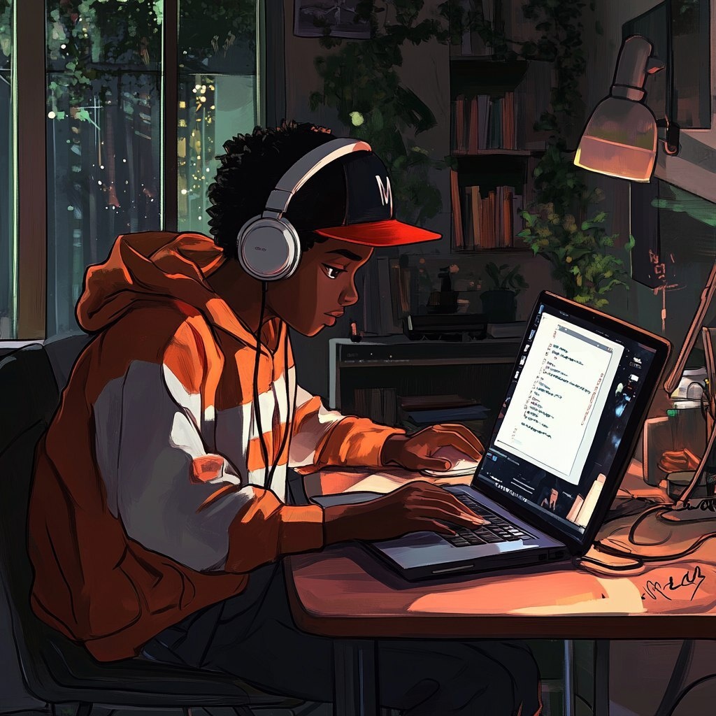 Автоперевод: Интерьер Panarama Best Please для изучения, далеко аниме -афроамериканский мальчик сидит дома перед ноутбуком на столе, с книгой рядом с ним, он пишет кое -что, одетая в пару наушников BLE с бейсбольной кепкой.