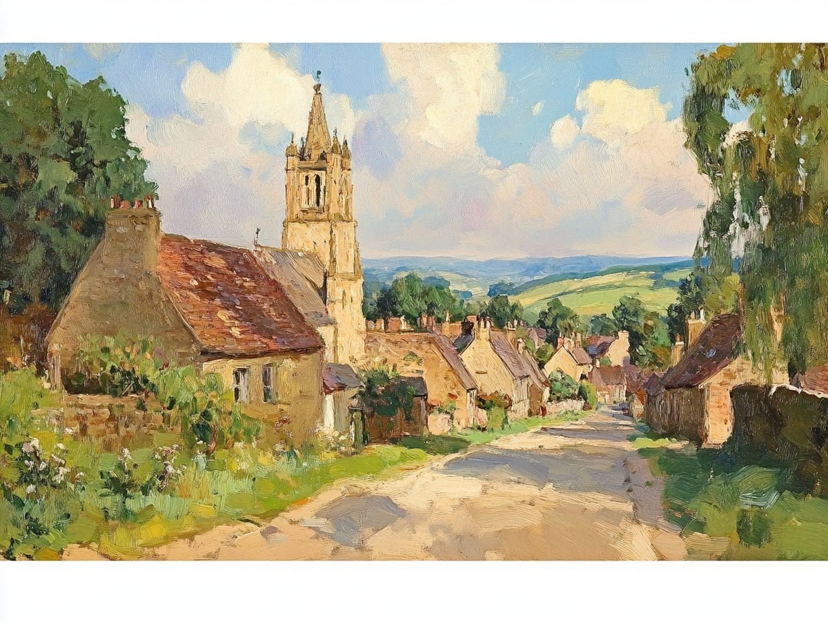 Создано на основе запроса: Edward seago impressionistic style, rural english village street scene, church in backround, distant hills
