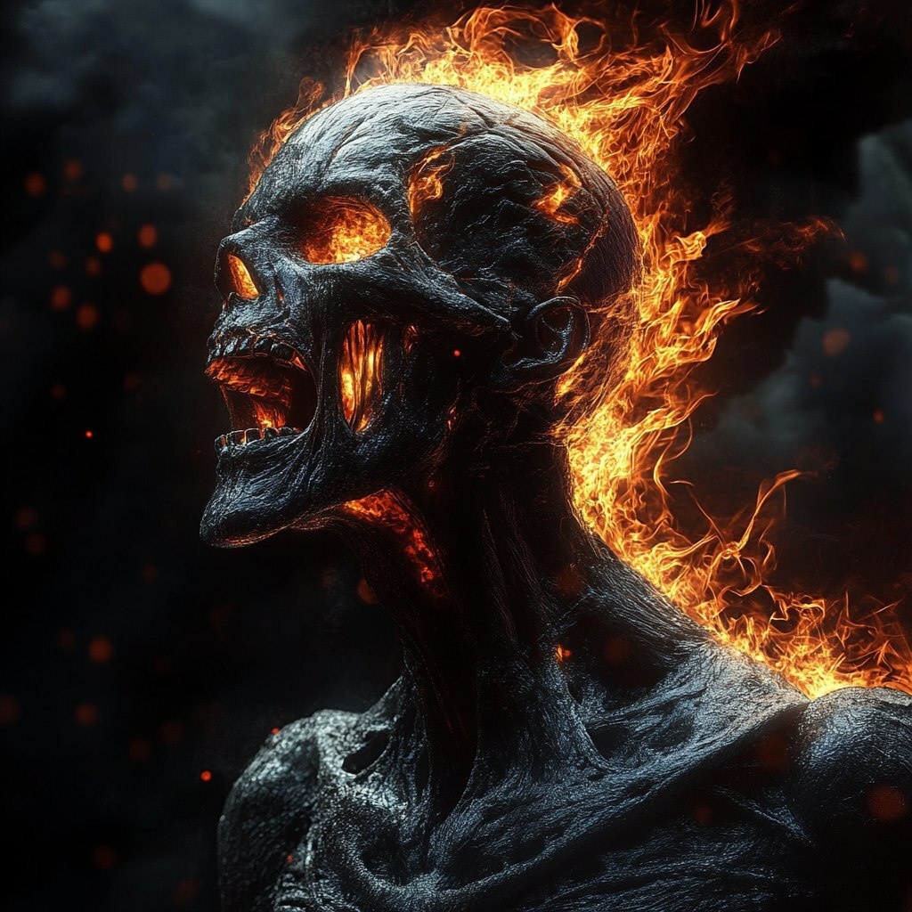 Создано на основе запроса: extremely detailed and realistic, total black background, burning soul, pain