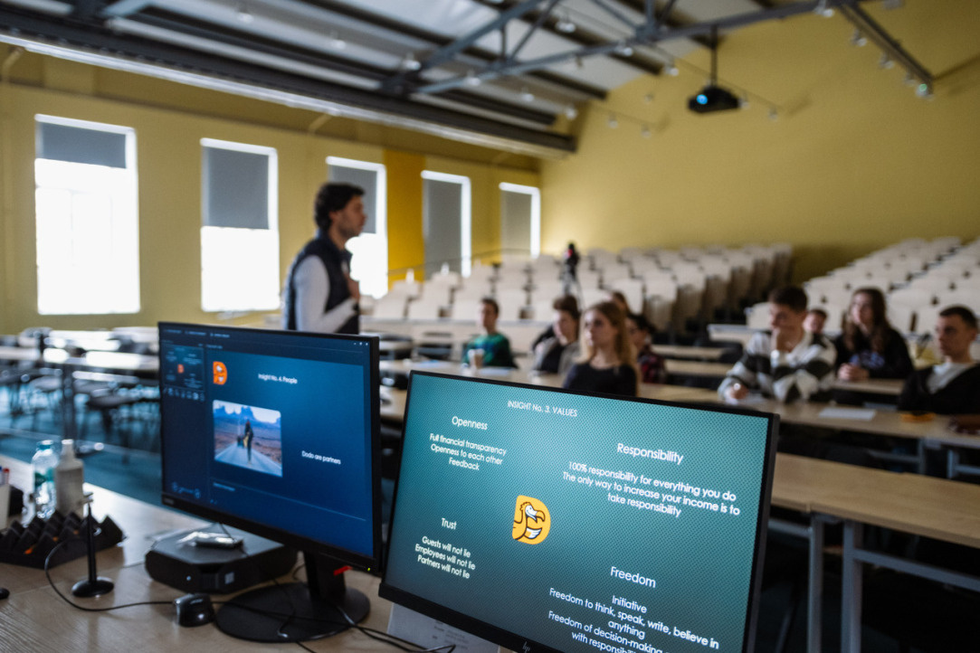 В НИУ ВШЭ — Санкт-Петербург прошел мастер-класс для студентов программы «Международный бакалавриат по бизнесу и экономике». Партнер-франчайзи Dodo Brands Юрий Костин поговорил с участниками о подходах к построению команды и мотивации сотрудников, рассказал, какое значение в карьере имеет мышление и психология, а также поделился несколькими советами и лайфхаками для будущих бизнесменов.