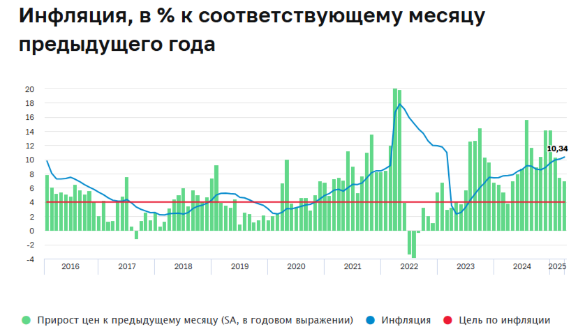 Ⓜ️ По данным Росстата, за период с 8 по 14 апреля ИПЦ вырос на 0,11% (прошлые недели — 0,16%, 0,20%), с начала апреля 0,27%, с начала года — 2,99% (годовая — 10,34%). В апреле 2024 г. инфляция составила 0,50%, с такими темпами как в апреле 2025 г. мы можем выйти на плато, что для ЦБ будет положительным сигналом. Но, месячный пересчёт марта оказался выше недельных данных — 0,65% (недельная — 0,55%), о чём я вас предупреждал (недельная корзина включает мало услуг, а они растут в цене опережающими темпами). Такие данные выводят нас на 9% saar (месячная инфляция без сезонных факторов, умноженная на 12) — многовато и не даёт шанс на смягчение ДКП, поэтому большой вопрос какой пересчёт будет в апреле, не зря ЦБ на мартовском заседании предупредил: если динамика дезинфляции не будет обеспечивать достижение цели, ЦБ рассмотрит вопрос о повышении ключевой ставки (напоминание, что по ставке рассматривают 2 варианта: повышение или сохранение). Отмечаем факторы, влияющие на инфляцию: 🗣 Из потреби