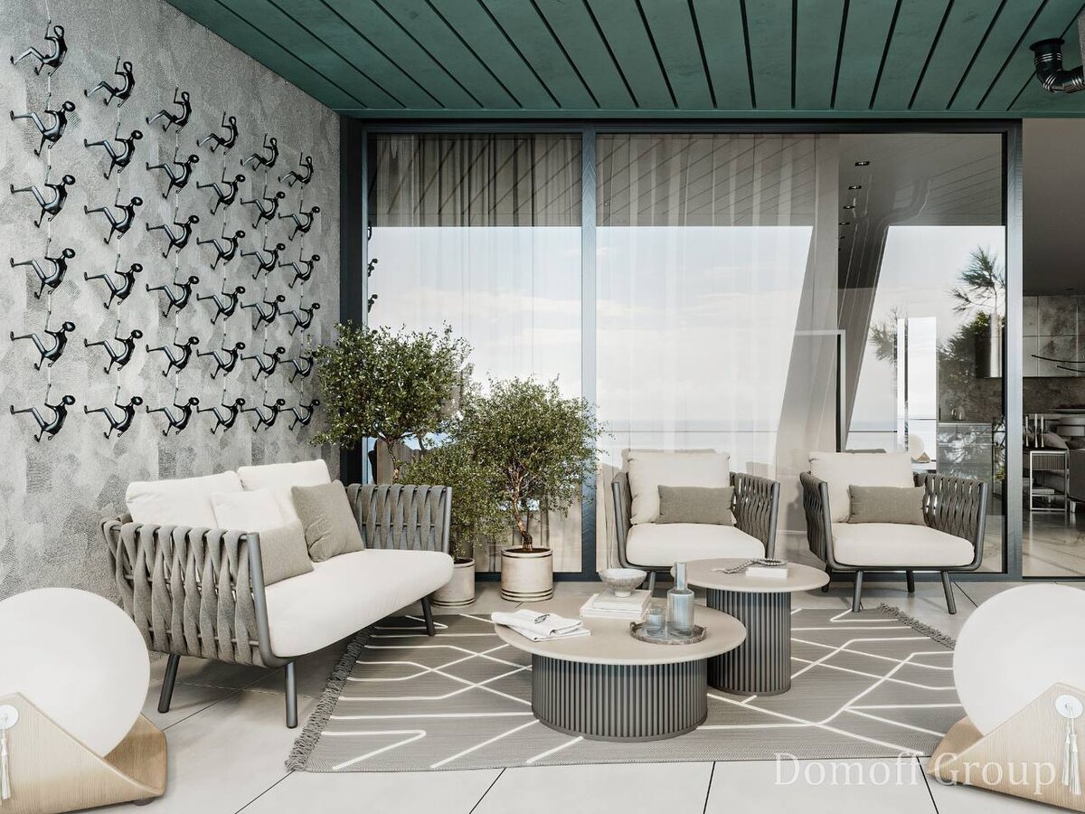 Проект DG 🩶 Современная терраса с видом на море: стильный оазис на свежем воздухе Перед вами пример гармоничного сочетания минимализма и уюта, где терраса становится продолжением жилого пространства, а не просто внешней зоной. Сдержанная палитра, органичные формы и неожиданные акценты создают атмосферу отдыха. Кресла с плетеными спинками, столики с рифленым основанием, большие пуфы и ковры с геометрическим орнаментом отлично вписались в этот “тихий” уголок в видом на море. Интересным решением стала декоративная стена с арт-инсталляцией из фигур-альпинистов - дерзкий штрих, добавляют интерьеру динамики. Зеленые акценты в виде оливковых деревьев в керамических кашпо и бирюзовый потолок перекликаются с морским горизонтом. Прозрачные шторы добавляют легкости и воздушности, играя с естественным светом. Интерьер получился современным, в меру строгим, но при этом уютным - что делает его идеальным местом отдыха под открытым небом.