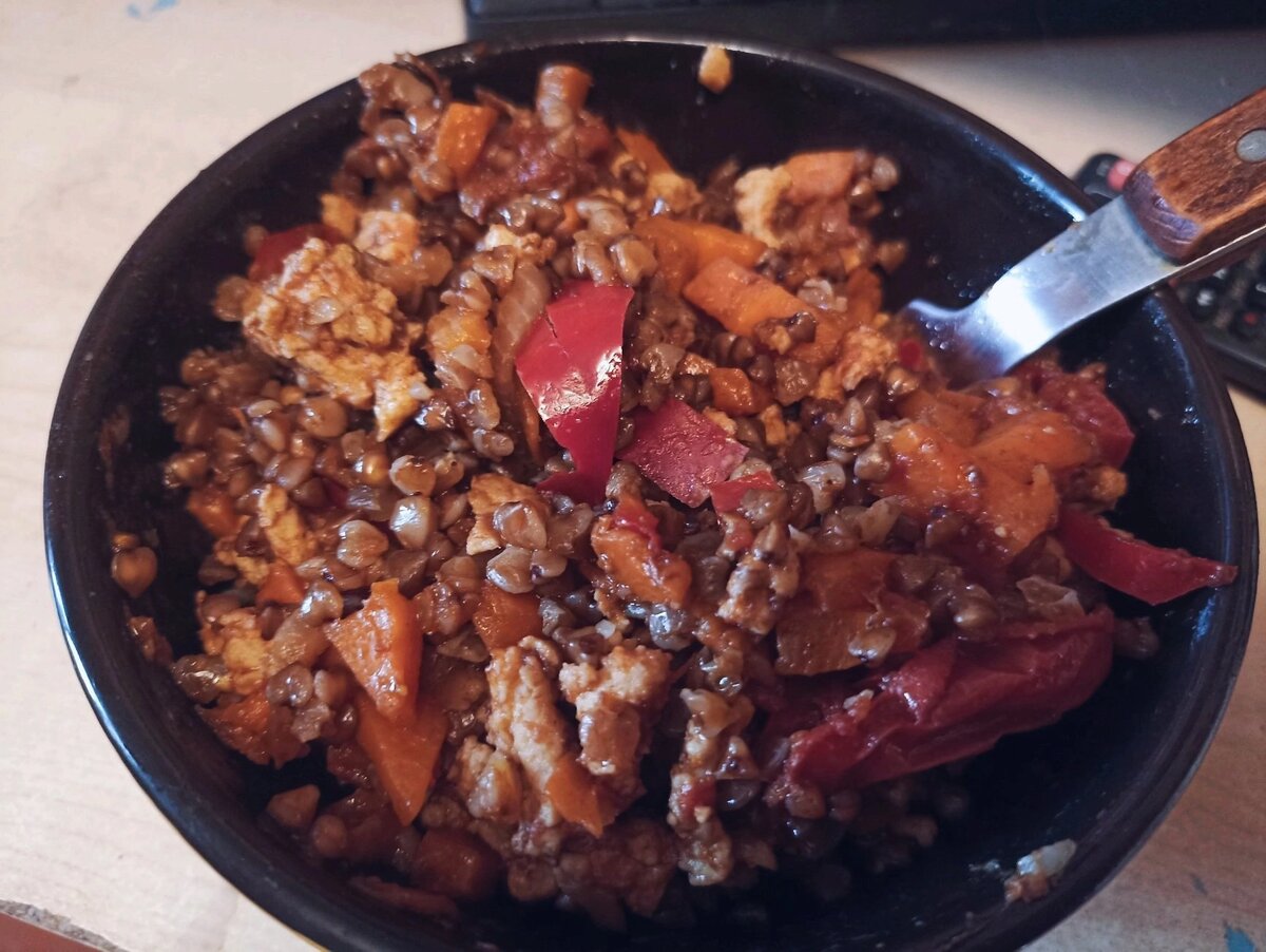 Сначала - всегда морковку. Одну большую, а вторую маленькую, чтобы никому не обидно и всем комфортно: кубиками еë сантиметра эдак по полтора, и - до зажаренной корочки. Вообще вот тут не ждите никакой справедливости и морали: пока режем одно - жёстко отжариваем предыдущее! Потом туда же нежный лук. Руководство для невинных душ - лук взять за хвостик, не бойтесь, и четвертинками его, а четвертинки - нашинковать, всплакнув от предвкушения счастья. Затем парочку красных болгарских перчиков, небольших - это нормально, так вот, сочччными кусочками их, и всё туда же. Теперь властно перемешаем всю жару, напевая песенку о. У вас обязательно должна быть дурацкая ненавистная песенка, нелегально завладевшая мозгом, вот её и поём, тихонько или нет. Закрываем дверь перед носом соседа, притащившегося на запах. Объясняем ему, что нет, не сегодня и не сюда. Глубоко вздыхаем в преддверии полного и абсолютного вашего личного пищевого оргазма, и достаëм из холодоса размороженный заранее куриный фаршик
