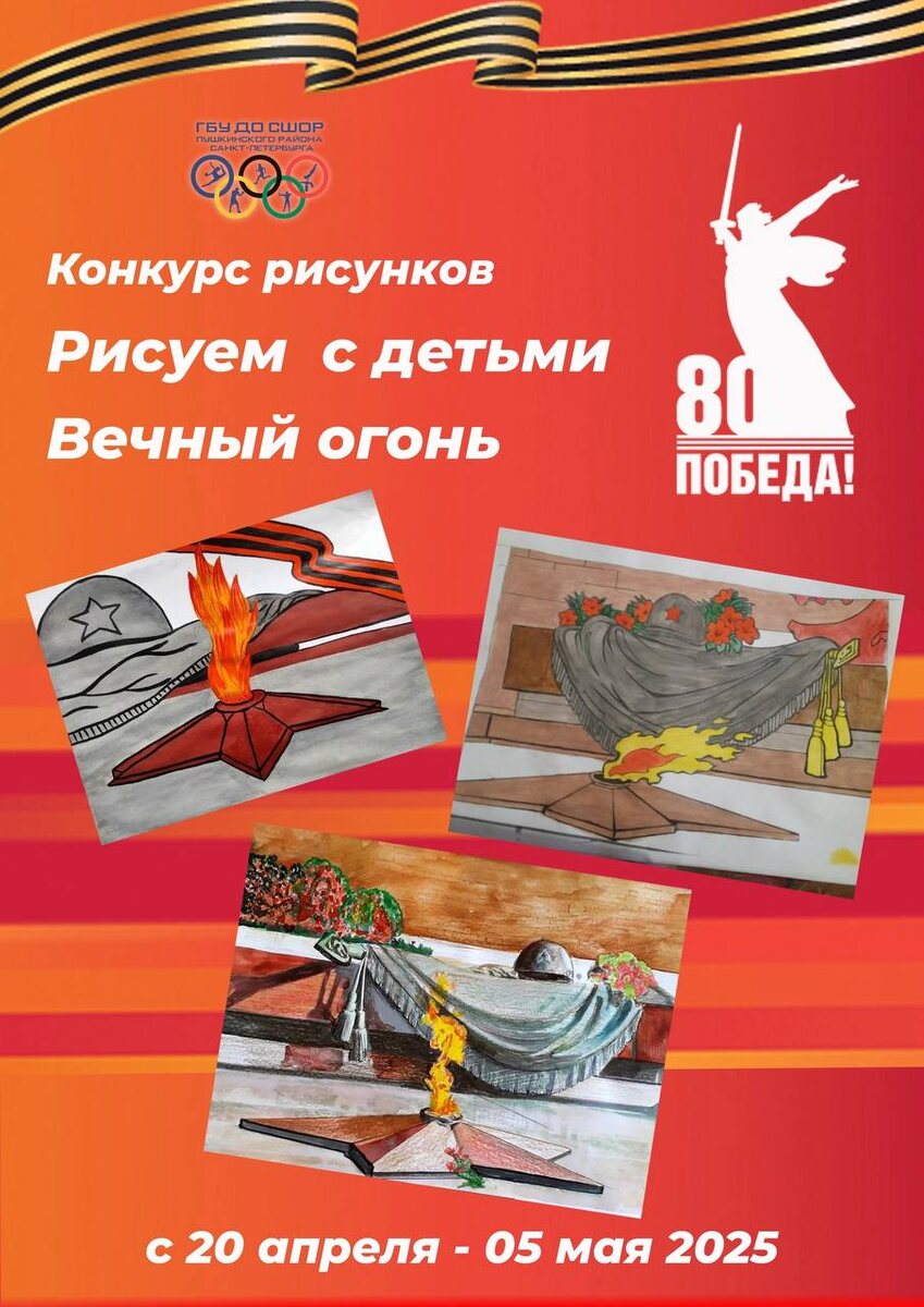 🎨Конкурс творческих работ "Рисуем с детьми Вечный огонь" 👉К участию приглашаются все спортсмены, обучающиеся в СШОР Пушкинского района Санкт-Петербурга. ℹТребования к оформлению работ: ✔рисунки, плакаты на бумаге формата А4 или А3; ✔выполнение в любой художественной и графической технике (гуашь, акварель, тушь, коллаж, аппликация, цветные карандаши и т.п., либо смешанные техники); ✔в работе должно быть изображение Вечного огня. ℹ Прием работ осуществляется в период с 20 апреля по 5 мая 2025 года. ✍Готовые работы необходимо подписать: фамилию, имя, возраст, спортивное отделение, и прислать нам на электронную почту: sds.push@yandex.ru с подписью "Победа 80" в любом удобном для Вас формате: jpg, png или pdf. Оригинал работы можно передать тренеру-преподавателю или администраторам школы. Все творческие работы будут обязательно вывешены на территории нашей любимой СШОР и опубликованы в сети Интернет, а все участники будут награждены памятными дипломами! ❤Ждем с нетерпением Ваших ра