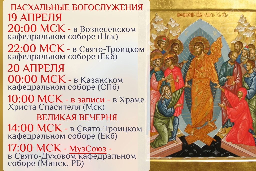 СВЕТЛОЕ ХРИСТОВО ВОСКРЕСЕНИЕ. Расписание прямых трансляций праздничных богослужений на телеканалах "Союз" и "МузСоюз":