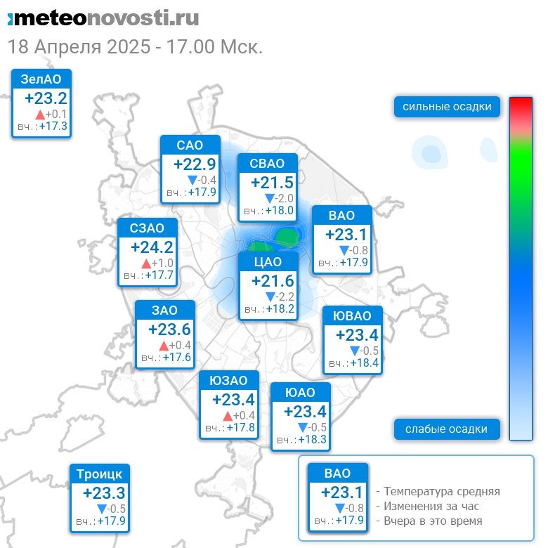 В 17:00 в Москве было от +21.3°C до +24.6°C, средняя температура +23.3°C #погода #Москва #весна #температура #18апреля #пятница