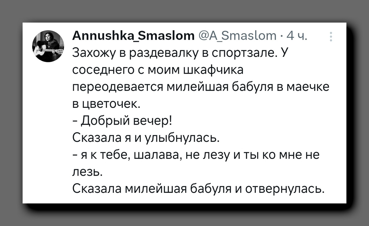 История из Сети о том, как отреагировала на приветствие девушки пожилая спортсменка. А теперь продолжение от меня. ⚠️ Давеча во время обеденного перерыва я зашла в супермаркет за бутылкой воды и йогуртом. Стою в очереди в кассу, передо мной – женщина без возраста. Из тех «прелестниц» с недовольным выражением лица, как если бы все вокруг забыли, что она - главный центр вселенной, и ей все должны. Рассчитываясь за покупки, матрона уронила монетку. Я, не осознавая всех возможных последствий, решила оказать содействие, подняв её денежку. Только я касаюсь монетки, как эта особа, не моргнув глазом, орёт на весь магазин: «Понаехали! Мои деньги тырят прямо у кассы!» Очередь медленно оборачивается в мою сторону, а кассирша делает такое лицо, будто сейчас начнет стримить это на TikTok. Я, опешив от такой реакции, лепечу: «Я хотела помочь...» Но «персонаж в юбке» уже на взлёте, кричит: «Помогать она хотела! Карманы мои хочешь обчистить, ворюга при макияже!» Занавес…😲 🎭 Прихожу в офис, немног