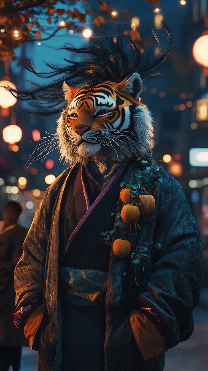 Создано на основе запроса: An image for an advertisement. A nighttime scene. A dried persimmon , goofy anthropormic tiger, with blowing long black hairs, dressed in modern clothes. He is smile to someone. The image is playful and cartoonish. --- Автоперевод: Изображение для рекламы. Как тебе такая генерация? 🤔 https://dzen.ru/id/65c0c65c86e4f837c27b24d7 #ИИ #AI #нейросеть #midjourney #art
