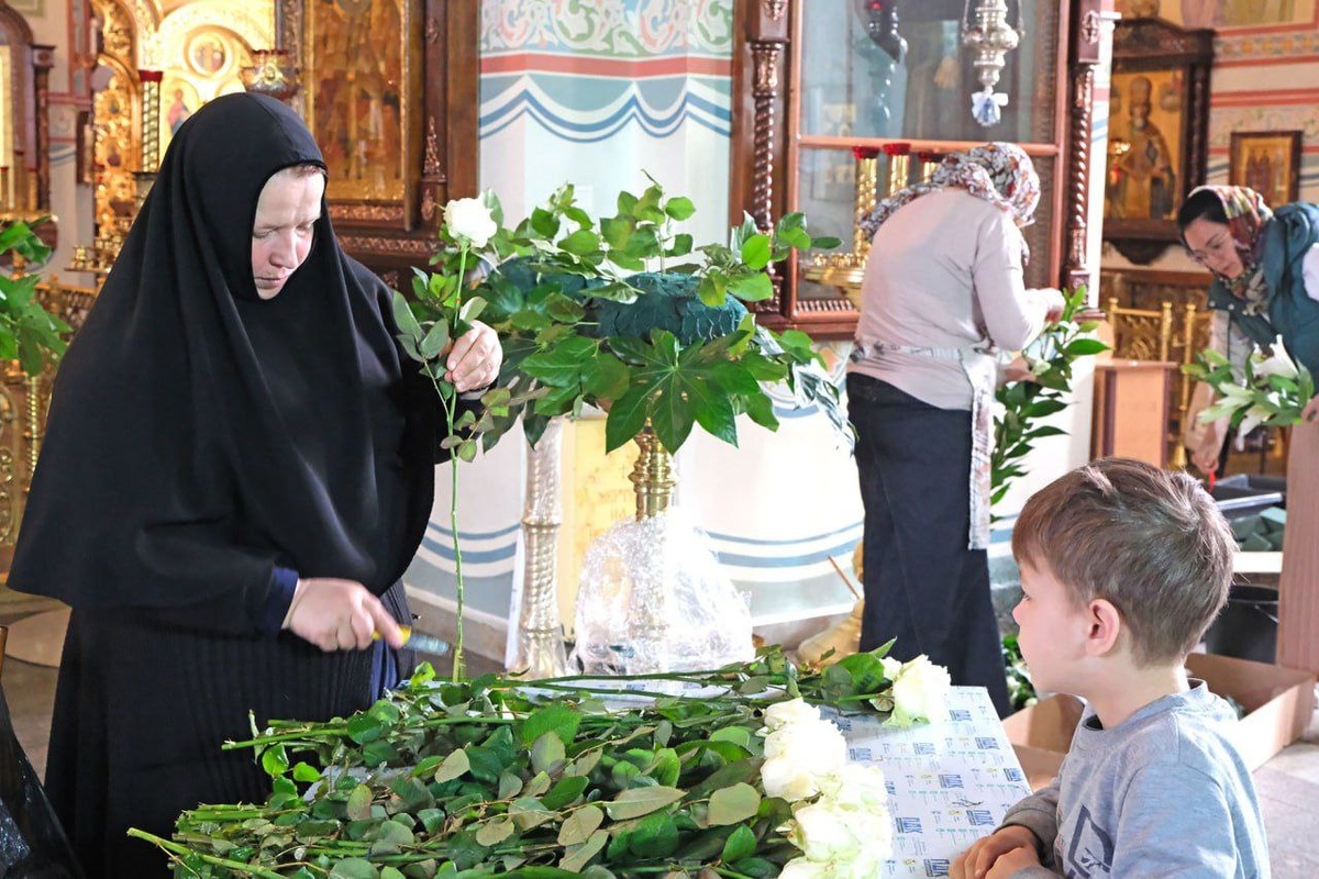 Флористки с помощниками трудятся над украшение сени. Под нее будет положена Плащаница с изображением положенного во гроб Спасителя. Дивеево