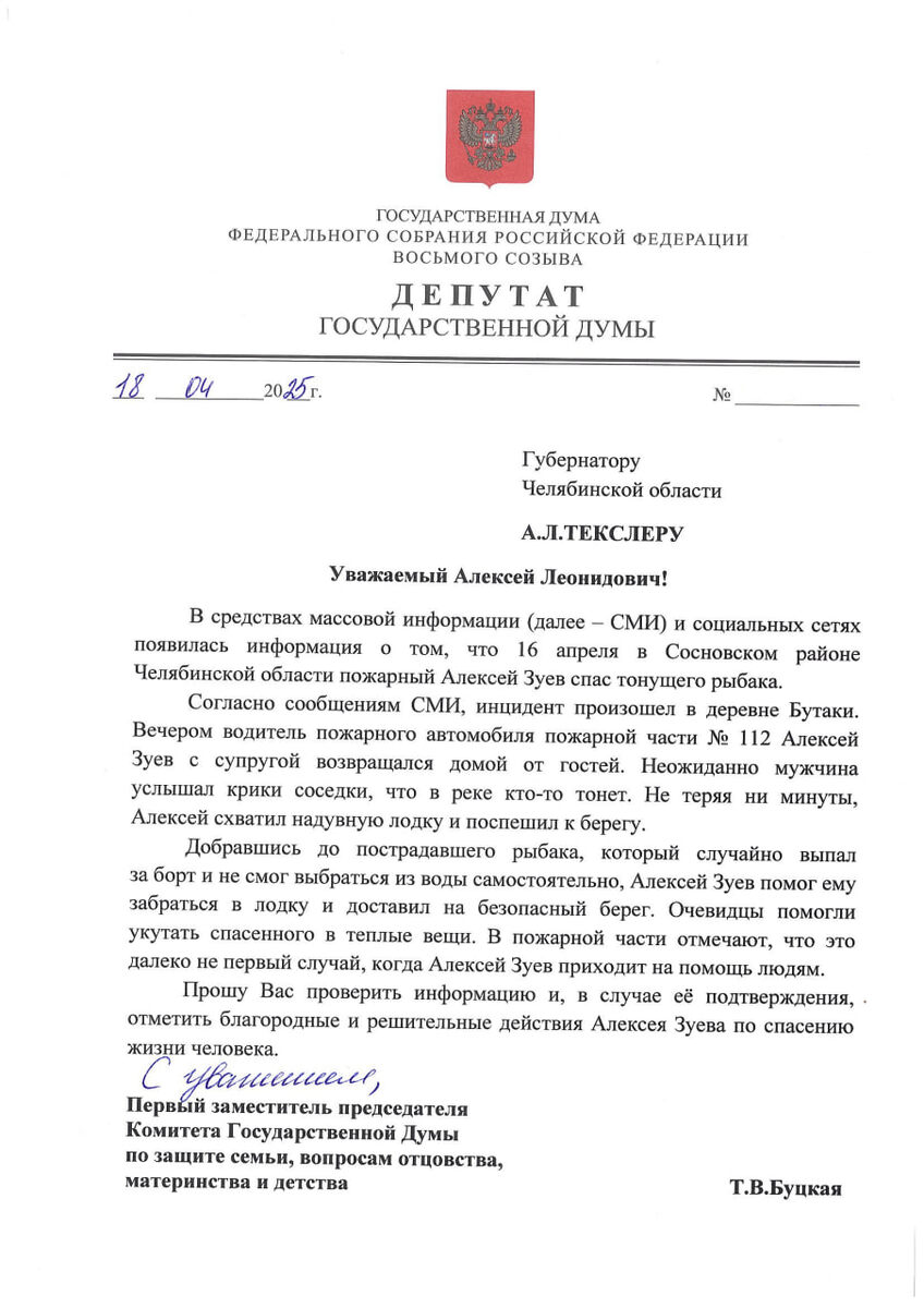 📨 Я написала обращение на имя губернатора Челябинской области Алексея Текслера с просьбой отметить благородные и решительные действия героя, благодаря которому удалось спасти жизнь человека.