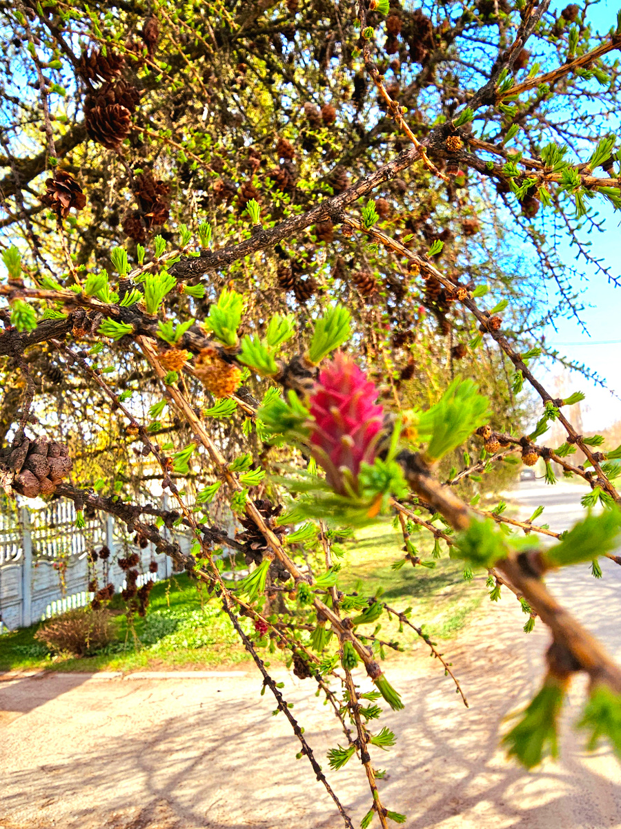 На пути мне встретился участок дороги, который начал подниматься с уклоном порядка 45 градусов. Это было нелегко, но я настроил себя на позитив и продолжал двигаться вперед, наслаждаясь живописными пейзажами вокруг. По дороге я не мог удержаться и делал фотографии появившейся зеленой листвы и свежих шишечек. Такой контраст весенней природы наполнял меня радостью и восхищением.