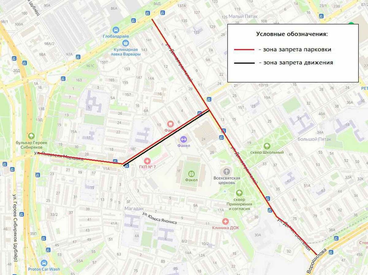 В связи с проведением футбольного матча Премьер-лиги на стадионе «Факел» 20 апреля будут введены запреты на движение и парковку в окрестностях спортивного объекта. Как сообщили в управлении дорожного хозяйства Воронежа, с 18:00 субботы, 19 апреля, до 18:00 воскресенья, 20 апреля, будет действовать запрет на остановку и парковку транспортных средств на участках улиц Домостроителей (от пересечения с улицей Ворошилова до улицы Пеше-Стрелецкой) и Писателя Маршака (от улицы Домостроителей до улицы Героев Сибиряков). А уже в день матча, 20 апреля, с 07:00 до 18:00 будет полностью перекрыто движение для автотранспорта на участке улицы Писателя Маршака, начиная от дома №18А и до пересечения с улицей Домостроителей. В период действия ограничений некоторые автобусные маршруты претерпят изменения: - автобусы №№12, 54, 72 будут следовать в объезд по улицам Героев Сибиряков, Пеше-Стрелецкой, Домостроителей, Ворошилова, минуя обычный участок маршрута от остановки «Юго-Западный рынок»; - автобус №17