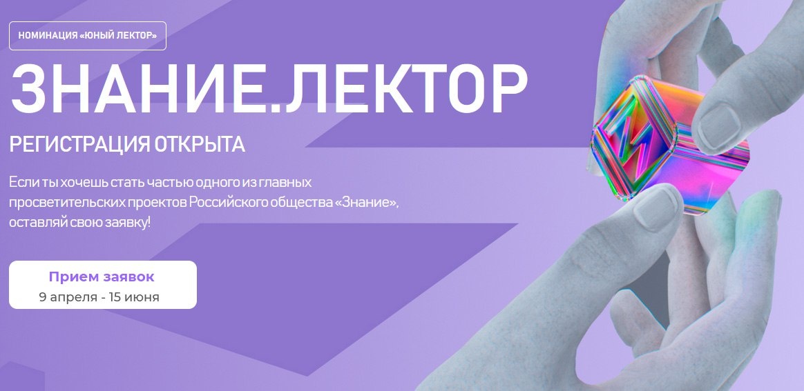 🔔 V сезон всероссийского конкурса Знание.Лектор Прием заявок для участников от 14 до 17 лет: 9 апреля-15 июня Организатор: Российское общество "Знание" Всероссийский конкурс предназначен для юных лекторов от 14 до 17 лет, готовых делиться знаниями с широкой аудиторией и учиться публичным выступлениям со сверстниками. 🏆 Участники могут проявить себя в номинации «Юный лектор». Сто лучших школьников отправятся в Международный детский центр «Артек», а финалисты встретятся на трёхдневном финале конкурса в столице в ноябре 2025 года! Подать заявку #Участвуй