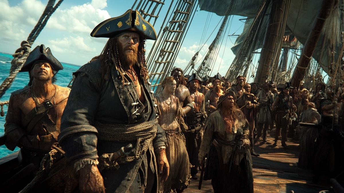 Создано на основе запроса: A hyper-realistic, cinematic horizontal scene of a pirate ship in the Caribbean under a bright sunny sky. The ship is made of aged dark wood, with torn black sails and classic pirate details. A diverse crew of pirates men and women aged 30 to 60, rugged, scarred, and sunburnt stands on the main deck, facing the viewer with intense expressions. Some wear tricorn hats, others bandanas or coats with golden buttons. The Caribbean sea behind them is turquoise, calm, with tropical islands on the horizon. Bright sunlight illuminates their faces. The scene is designed for a YouTube banner, realistic and epic.