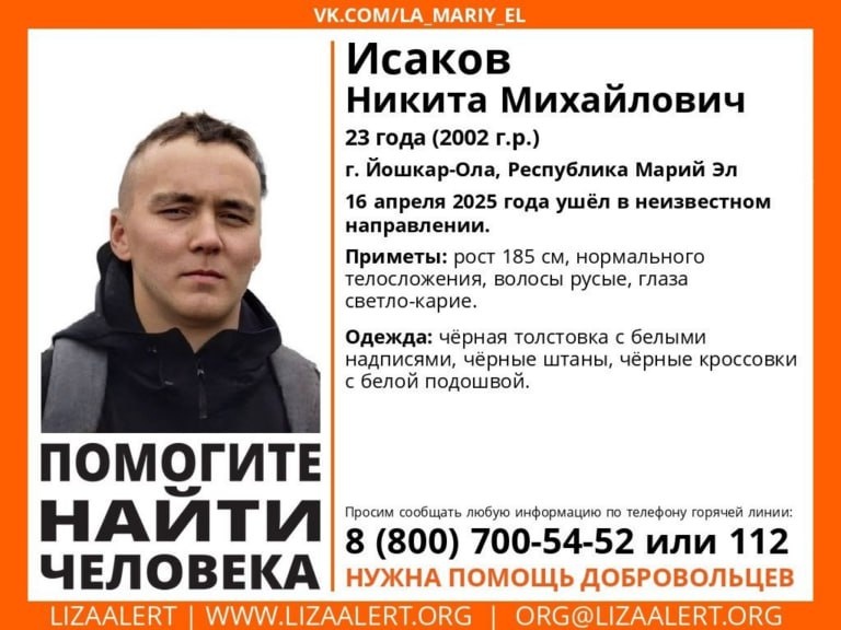🆘В Йошкар-Оле пропал 23-летний Никита Исаков 16 апреля он ушел в неизвестном направлении и не вернулся. Поисковый отряд «ЛизаАлерт» Марий Эл просит о помощи всех жителей города. 📍Известны приметы пропавшего Никиты Исакова: рост 185 см, русые волосы, светло-карие глаза. В последний раз его видели в черной толстовке с белыми надписями, черных штанах и черных кроссовках с белой подошвой.