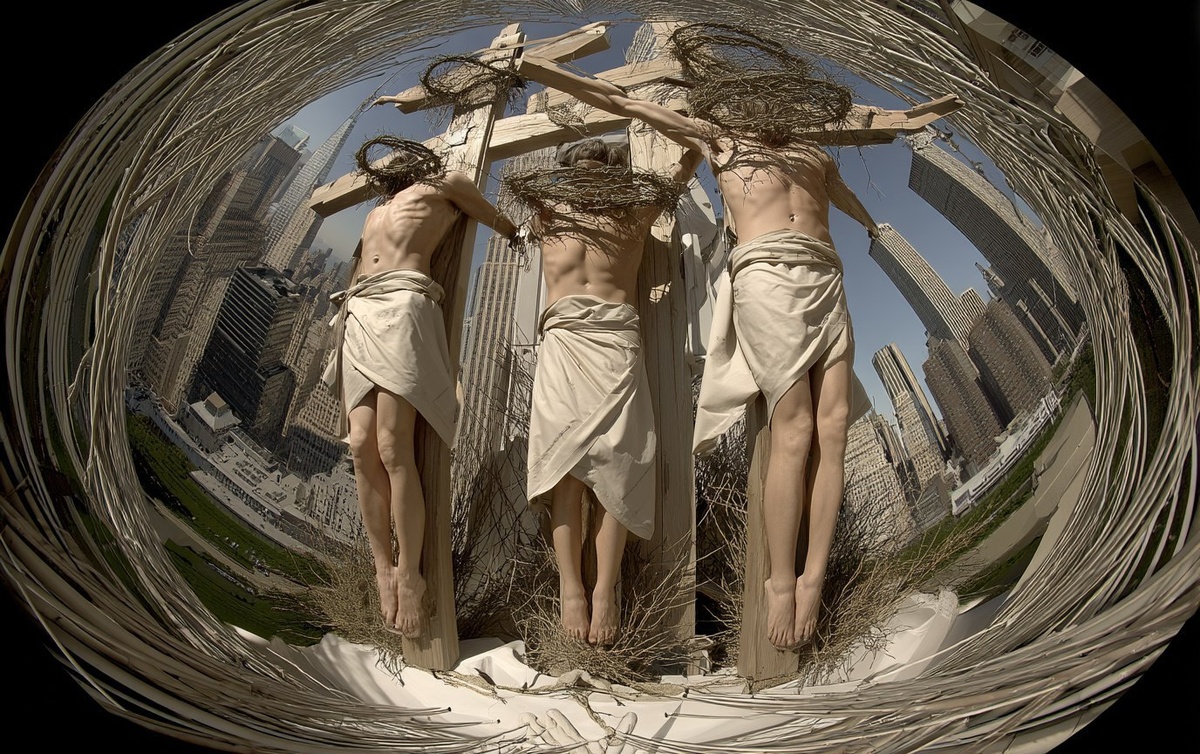 Создано на основе запроса: Fine Art, Circuitry, Dramatic, Wide Angle, Fisheye Lens, Light Mode, Torus, Angry, Evil, a landscape in the mountains in the closest mountain three crosses with three men nailed to them, wreath of thorns on their heads, white cloth around their waists, in the background you see the skyline of New York, --- Автоперевод: Изобразительное искусство, схема, драматическая, широкий угол, линза рыбьи, легкий режим, торус, злой, зло, пейзаж в горах в ближайшей горе три креста с тремя мужчинами, прибитыми к ним, венок из шипов на их головах, белая ткань вокруг их талию, на заднем плане вы видите горизонт Нью -Йорка, Неплохо выглядит? 🤔 https://dzen.ru/id/65c0c65c86e4f837c27b24d7 #ИИ #AI #нейросеть #midjourney #art